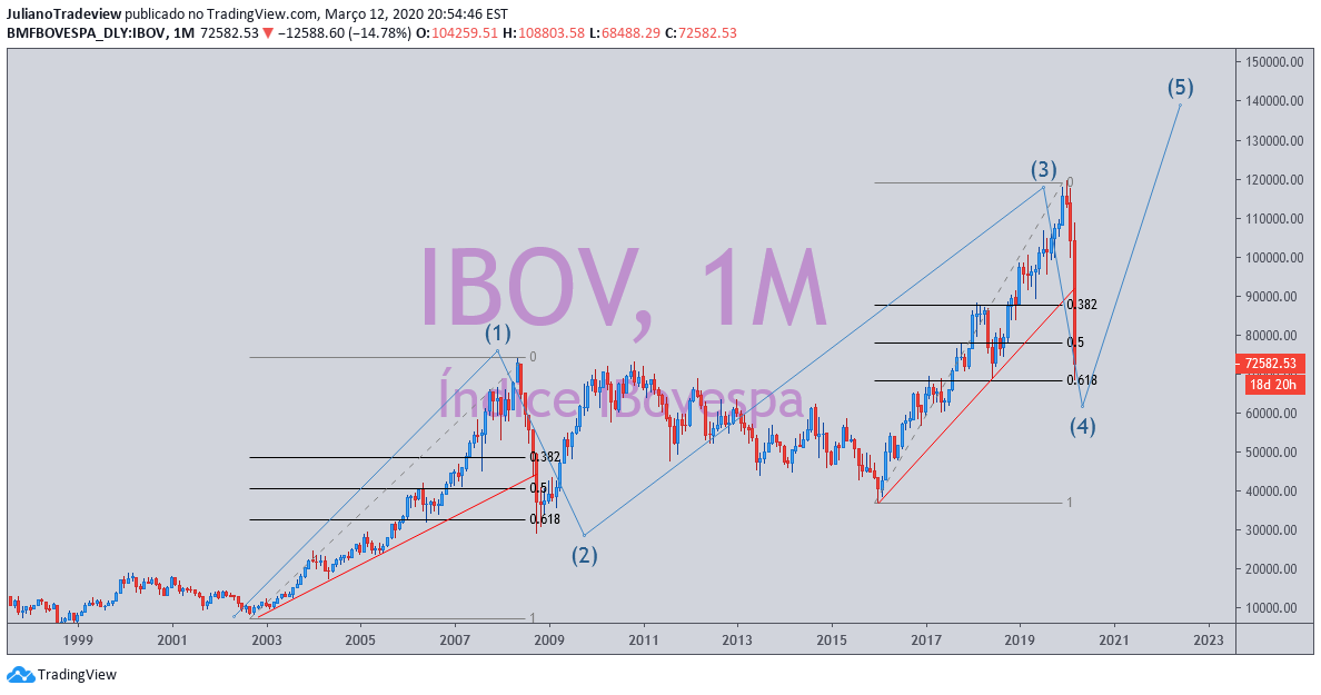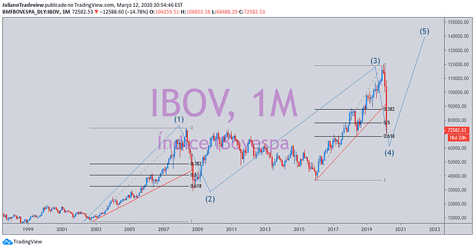 Boa Tarde, existem varios traçados possíveis, este é um deles. Mas pelas caracterisiticas das ondas o periodo que vem desde o topo de 2009 até o fundo de 2016, tem todas as caracterisicas de uma onda 4, então na minha analise estamos em uma correção ABC, e não em uma onda 4 como esta no desenho. As caracteristicas de correção são praticamente as mesmas, porem a a onda 4 tem um periodo de correção muito maior, e um alvo menor. quanto ao alvo ele se refere ao final da onda que no caso seria em 82.000.