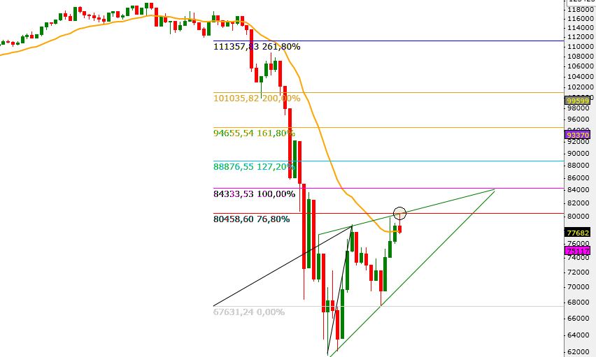 A mma200 esta perto de ser testada, o que se ocorrer será por volta do 82k, caso o triangulo do diário comece a desconfigurar. Isto só vai ocorrer se tivermos um fechamento nesta faixa, um simples teste não muda a possibilidade do triangulo no diário.
