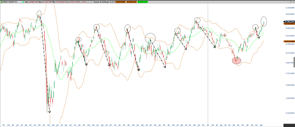 Coloquei esta movimento no gráfico, e o desenho ficou perfeito, e deu até para traçar a onda 3.1(5.3.1) que tem o objetivo em 22,46, muito perto do que vimos na analise por AT (sistema automatizado), em uma região que temos dois topos, sendo que um deles é o topo principal que se rompido estaríamos formando um pivot, que é um movimento clássico e importante. Então se este movimento se confirmar na semana que vem teríamos um pequeno avanço e depois a correção do que seria a onda 3.2 (5.3.2), mas no diário estamos operando acima da banda superior o que indica uma sobrecompra.