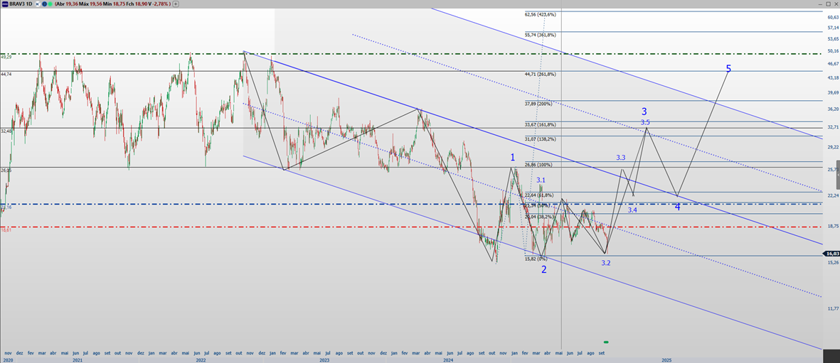 Antes de vermos os detalhes, pelo estudo estamos em uma onda 4, de um movimento que teve o seu inicio em 2016. A questão aqui é se esta onda 4 se encerrou e já demos inicio a uma onda 5 que tem o seu alvo em 45,40 pela marcação principal das ondas e 39,56 pelo tamanho da onda 1 e como o máximo permitido deste impulso em 53,27. Ou seja, estamos em uma tendencia de alta principal, e com um longo caminho para o ativo, que por simetria de tempo, deve atingir o seu objetivo em torno de 48 meses. Muito tempo pela frente, não é mesmo? Então vamos ver o nosso “agora”.