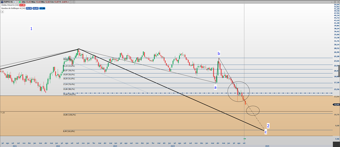 Olhando o gráfico, agora com uma visão mais longa, vemos que tivemos uma onda corretiva em um padrão zizzag, que tinha o alvo entre 16,73 e 15,97, mas que foi interrompida. A onda então pode ser marcada de duas formas. Como uma ABC, ou seja, a correção foi completa, e por isso podemos traçar o cenário de impulso que falamos acima, ou somente como uma onda “a”, o que permite a continuidade do movimento corretivo, sendo que não podemos passar dos 25,00 na formação da onda “b”.