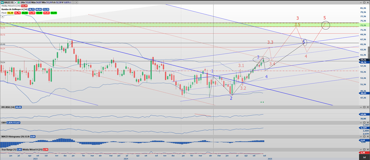Se e agente for otimista, o pior momento já passou e hoje temos o ativo começando o que pode ser uma onda 3 (5.3), em um movimento que tem como alvo 31,97, sendo que em um primeiro momento o alvo desta onda 3 esta em 27,42.