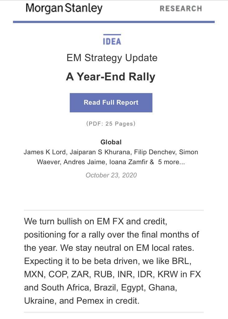 Não tenho relatório completo, mas tbm aguardo esse rali do real (brl) e bolsa, se tiver que chutar data diria a partir do dia 12 de novembro que é quando deve terminar o imbróglio da eleição nos EUA.