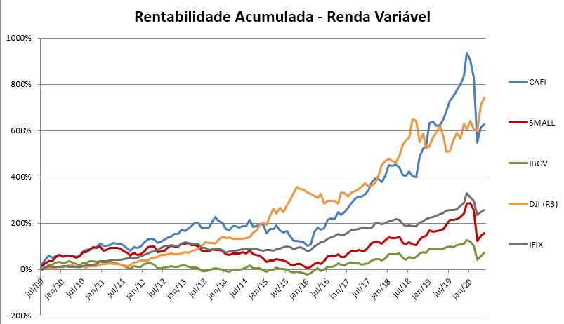 Mas veja a briga entre o Dji em R$ e a Cafi no gráfico. A Cafi antes da epidemia tinha aberto uma diferença muito grande. E depois desta queda o Dji em R$ passou a Cafi, mas é provável que quando o Ibov voltar a ficar acima de 100k, a Cafi volte a ser a mais rentável.