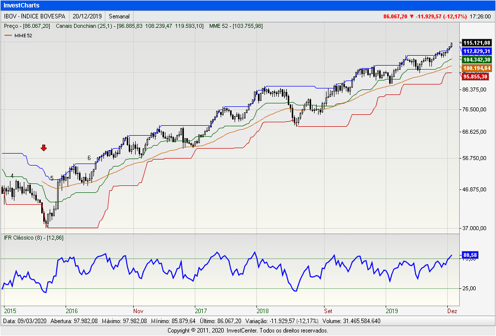 Isto foi em janeiro de 2016. Marquei com uma seta vermelha no gráfico abaixo. Veja o que aconteceu com o IBOV depois disso: