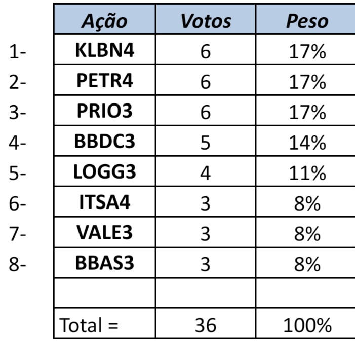 Peso papel 1 = (votos no papel 1)/(total de votos das 8 empresas da carteira) -