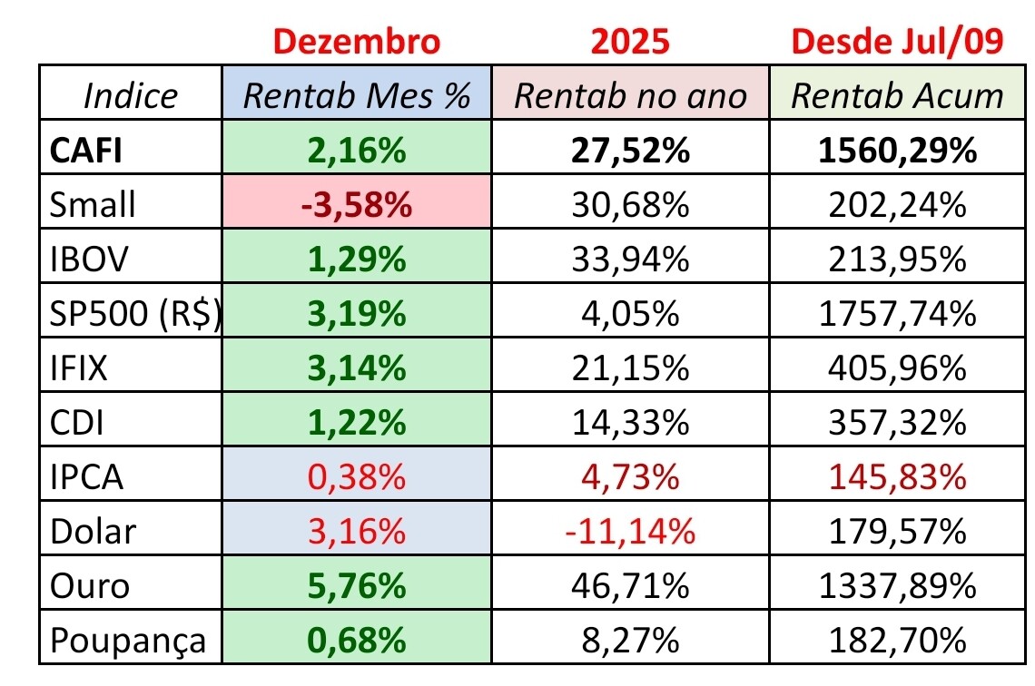 O valor usado para o resultado final do mês da CAFI é a soma da rentabilidade de cada ativo no decorrer do mês.
