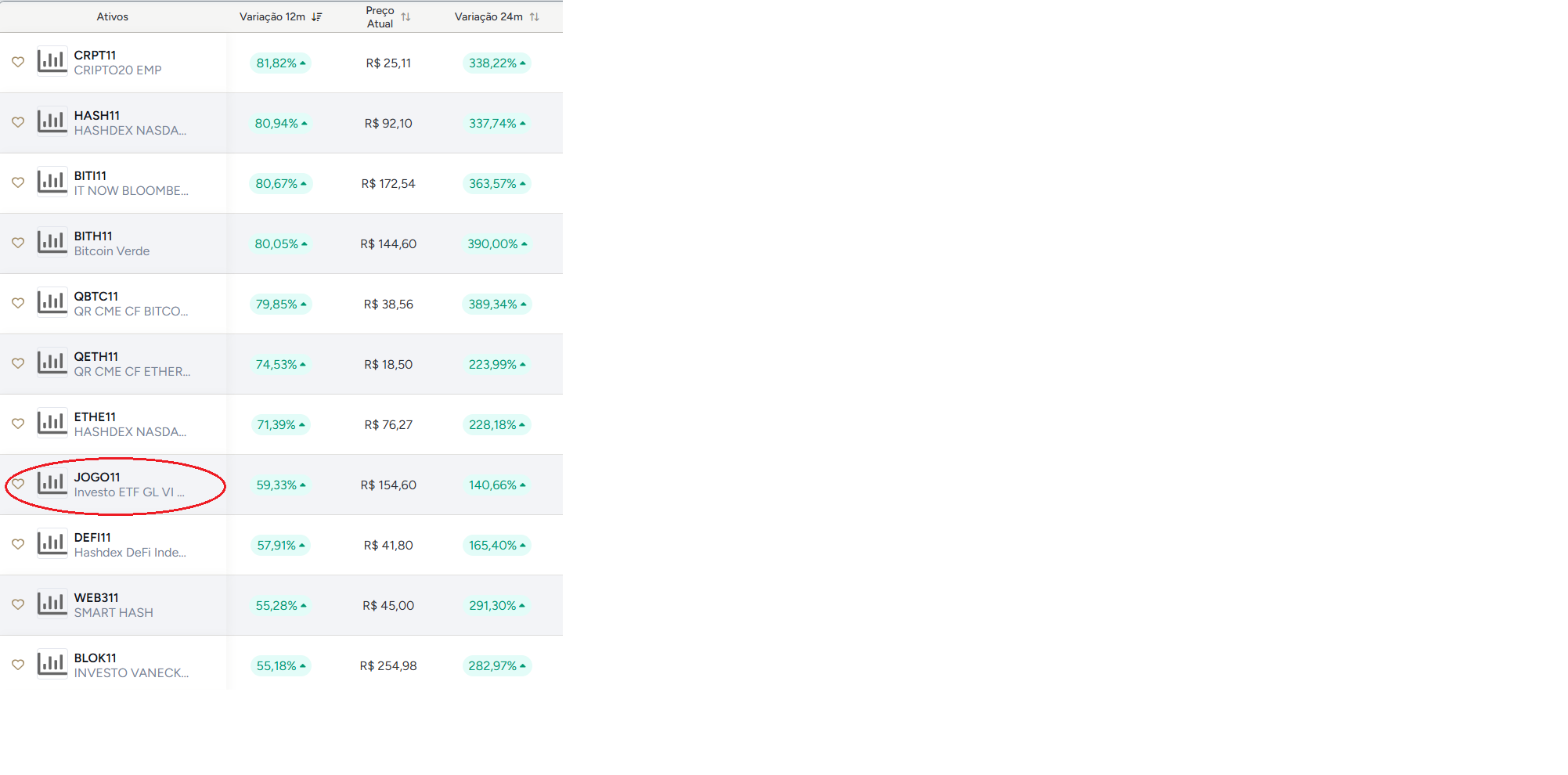 Sem querer me estender muito, estava procurando uma informação sobre um ativo e me deparei com este quadro. Acho pelo menos interessante postar, uma vez que acredito que toda carteira de longo prazo deve ter um pequeno percentual de cripos, e nada mais tranquilo do que investir através de Etfs. Tirando o Jogo11, que nada tem a ver com este mundo, vejam o rendimento que tivemos.