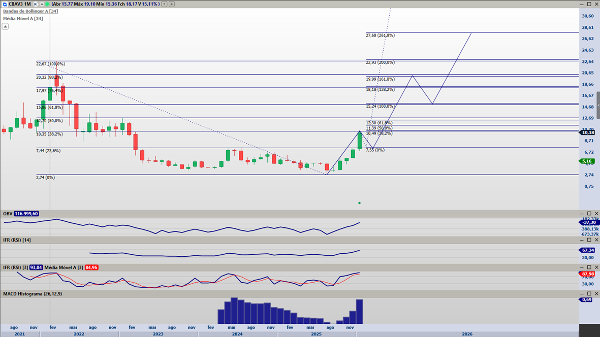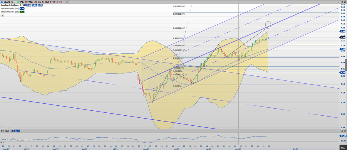 A CBAV3 vai cumprindo o traçado. Esperava um retorno até o 4,53, mas o recuo foi mais forte chegando aos 4,15. O movimento continuou valido e agora esta retornando buscando o seu primeiro alvo que agora esta em 5,42. Este movimento seria uma onda 1 e romperia o canal de prazo maior. O ideal é o que esta no desenho que eu fiz, após bater na região de 5,42 recuar até a região de 4,67 testando o canal rompido e ai sim dar inicio a onda 3, que pela projeção de Fibo e traçado dos canais levaria o ativo a 7,61. No meu caso só vou tomar uma posição maior no recuo da onda 2 e inicio da onda 3.