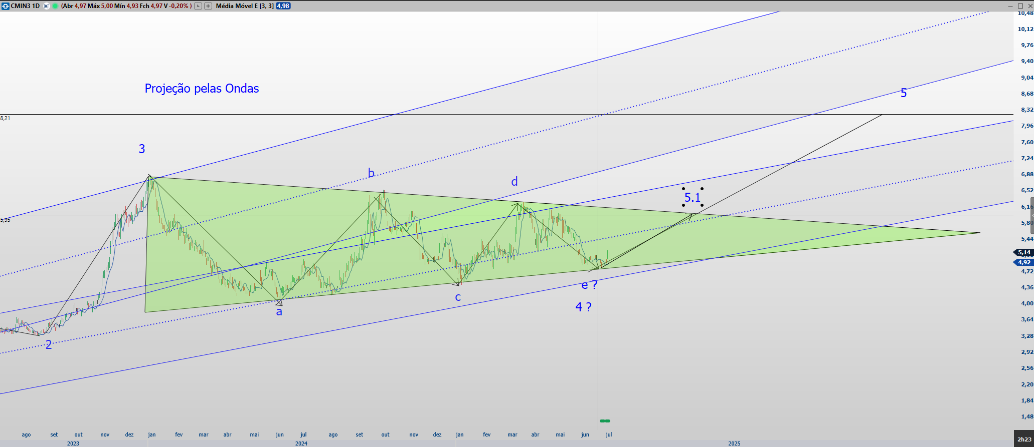 Embora não seja um estudo técnico, o padrão triangulo é muito consistente, e se de fato ele se confirmar é possível ver uma onda 5 levando o ativo até 10,76.