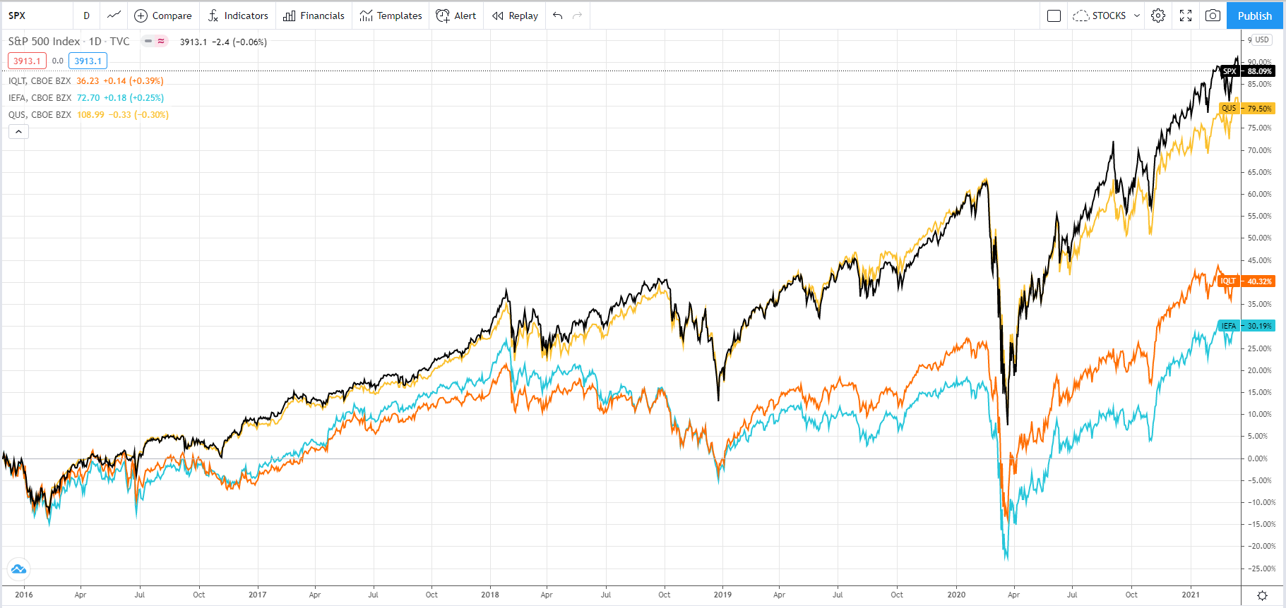 - o maior global (IQLT): vai na tocada dos mercados desenvolvidos (MSCI EAFE).