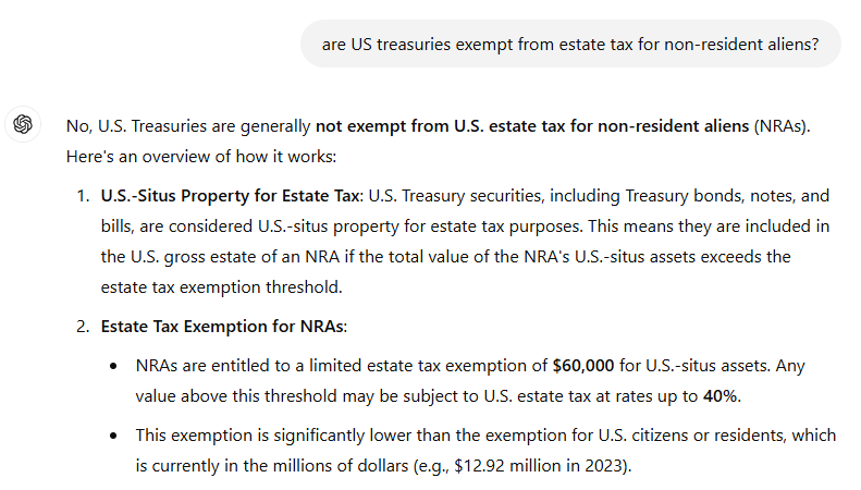(Também não achei informação explicíta de isenção de herança em tresuries para estrangeiro não residente.)