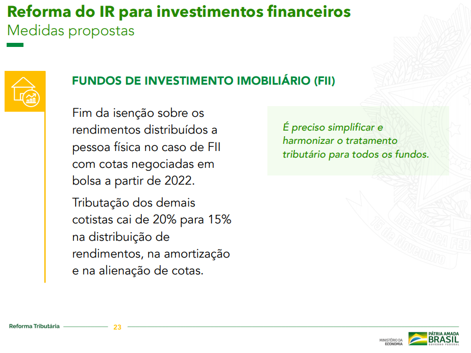 Amigo, pelo que eu vi, o texto estaria propondo uma tributação de dividendos em 20% para os FII, com isenção para valores de até 20 mil reais recebidos por mês. É isso? Ou não têm essa isenção?