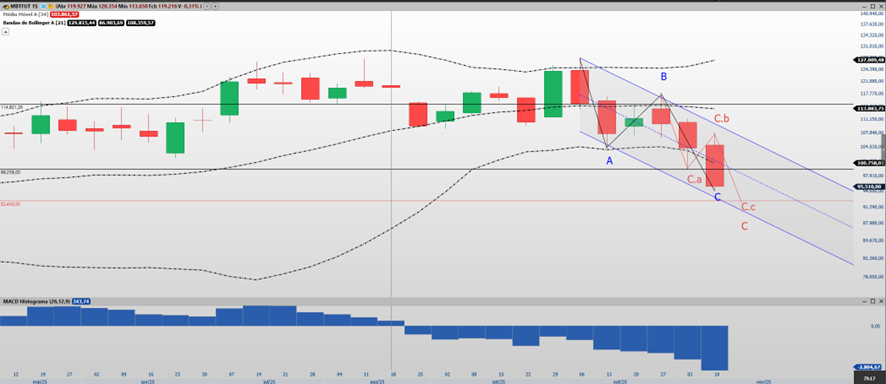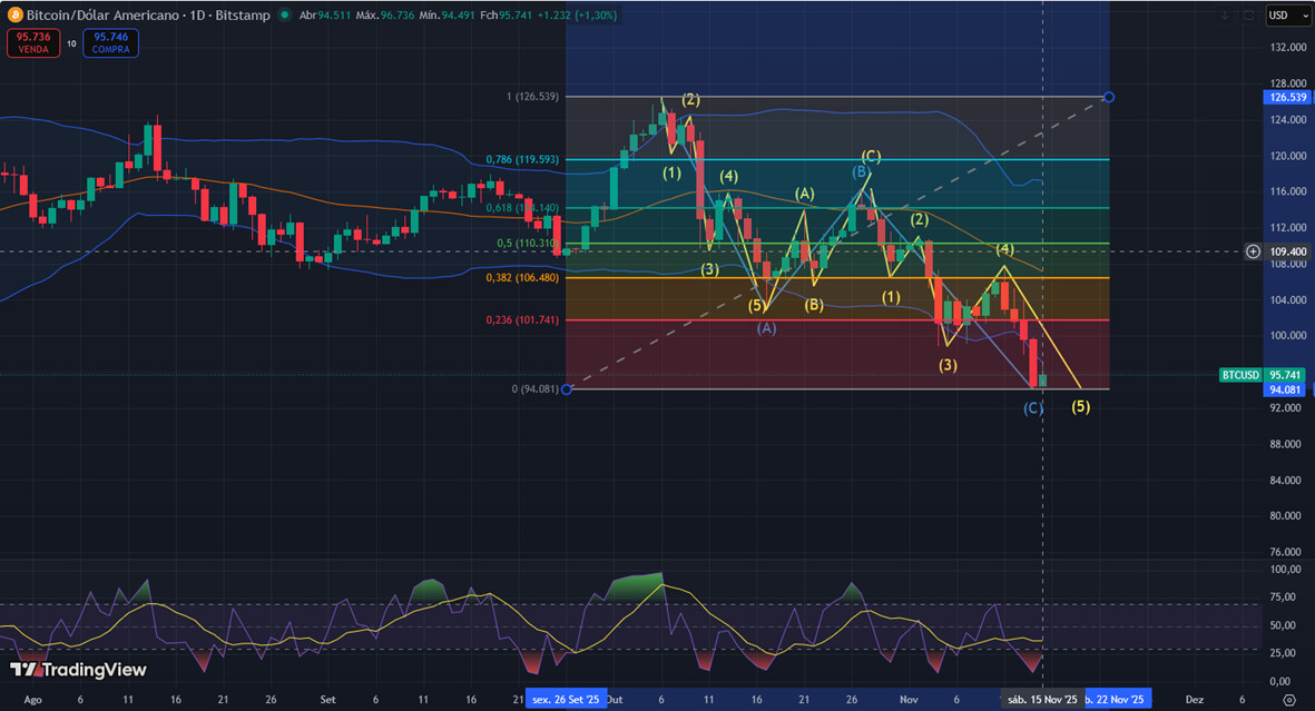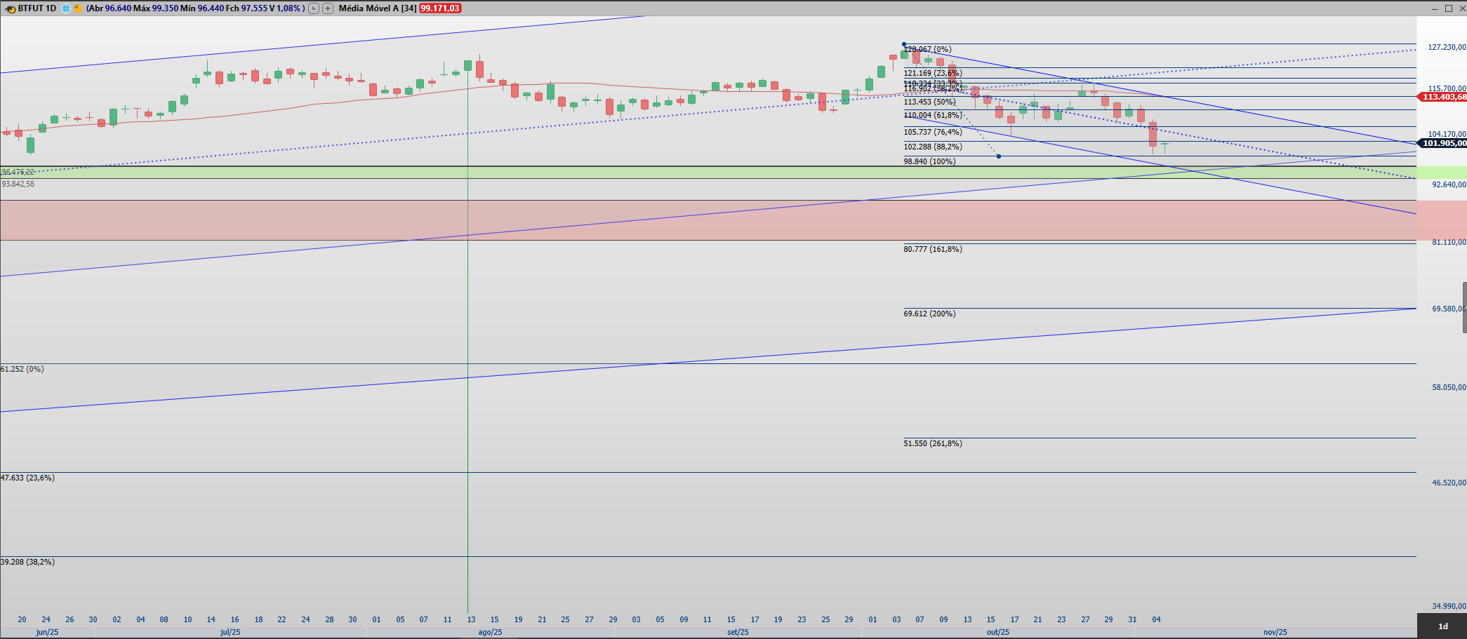 O que esperar agora? Como estamos fechando abaixo da BB(21,2), deveríamos esperar uma reação, embora ainda possamos buscar o alvo menor, antes da recuperação. Esta reação poderia levar o BTC de volta a 114.000, mas ainda poderia ser parte da correção e neste caso voltaríamos a ter o alvo na casa do 80.000. Ao contrario poderíamos também dar inicio a onda 5 fazendo a 5.1 em 124.000 pts.