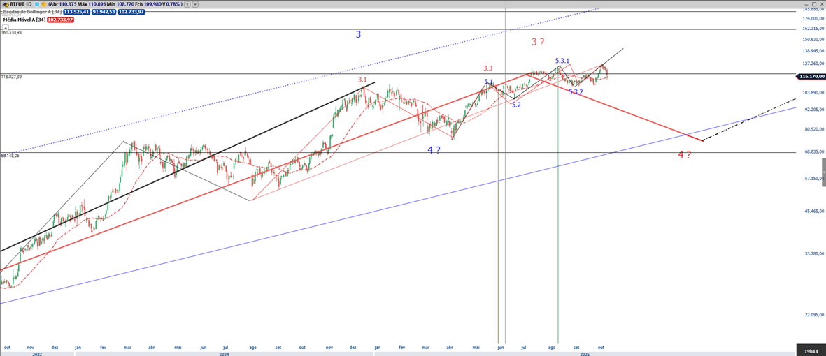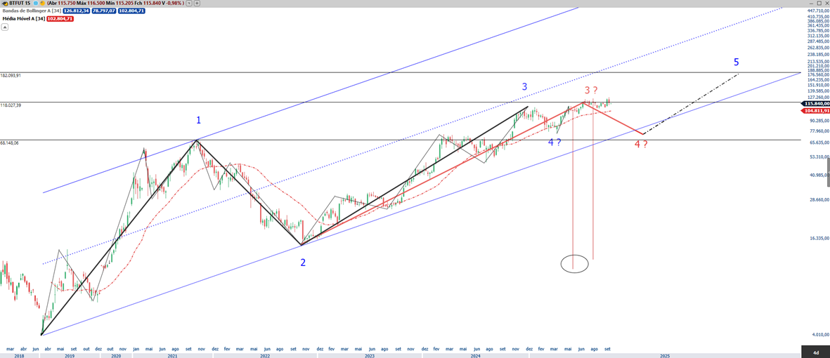 O traçado em vermelho do ultimo gráfico que postei sobre o BTC, tinha por objetivo demonstrar que tínhamos um outro cenário importante, e talvez o mais importante, porque não estaríamos lindando nem com uma onda 4, nem com uma onda 5 e sim com a continuidade da onda 3, que tinha o seu objetivo em 118.000 pts. Vou repetir o mesmo gráfico, só tentando melhorar a aparência. A importância de termos este cenário é que podemos estar caminhando para uma correção com o alvo em 80.000 pts. Já falamos sobre isto um tempo atrás e em parte este movimento havia sido descartado, e eu ainda acho que bem difícil que uma correção deste tamanho venha ocorrer, mas estamos olhando o gráfico e nele esta possibilidade é bem real.