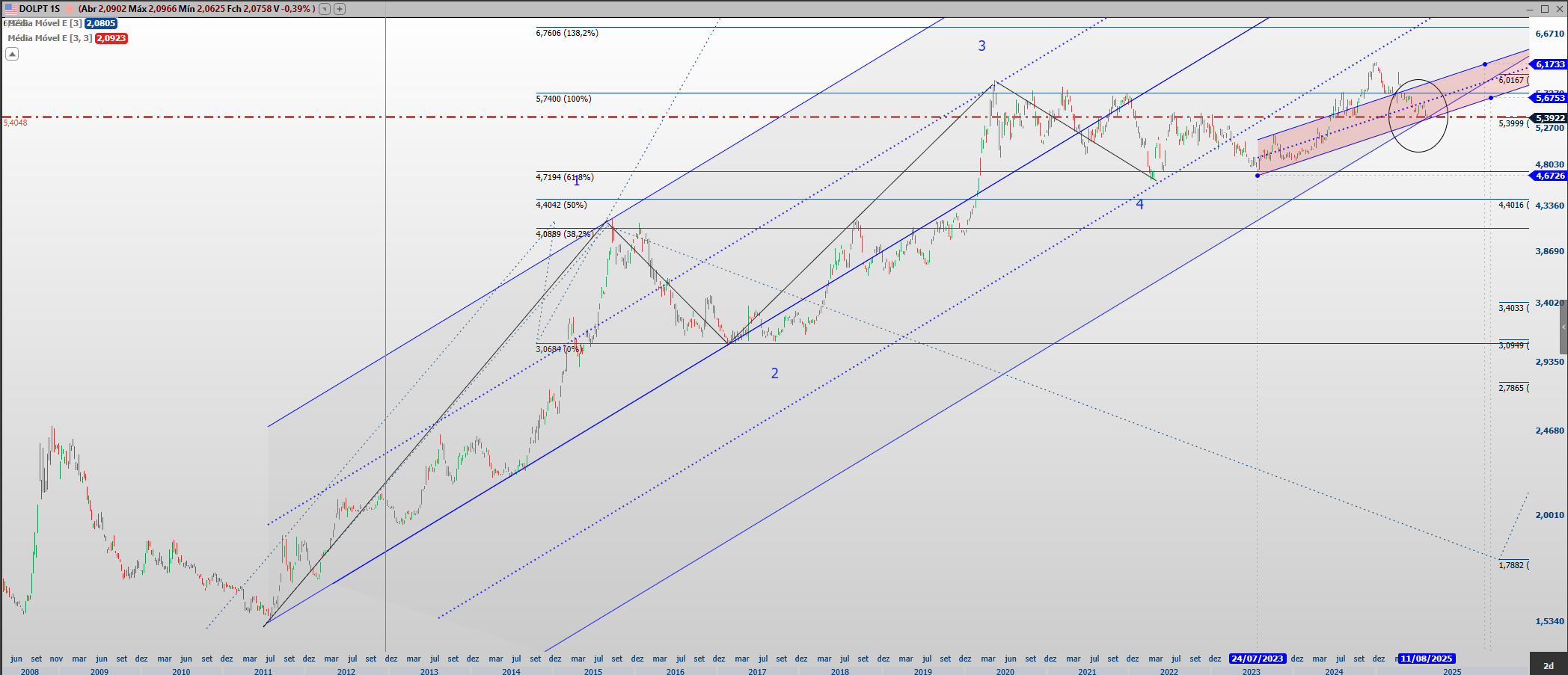 Temos um problema com a marcação do final da onda 1, porque a onda 1.3 teve o fechamento maior que a da onda 1.5, então temos que trabalhar com os dois números e neste caso o menor alvo fica em 5,336. Passando na mesma região temos um alvo importante que é a correção de 61,8% em 5,2868, e ambos os valores cruzam com a linha central do canal de alta. Mais uma região de forte resistência que se perdida, anula por completo o impulso de médio prazo e passamos a lidar com um cenário diferente de duração muito mais longa que eu já coloquei no post de 02/07/2025.