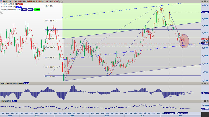 Graficamente o que ocorreu foi que finalmente rompemos os 5,38 que era uma barreira para a moeda americana, então é um bom momento para rever os estudos e ver onde fica o próximo alvo.