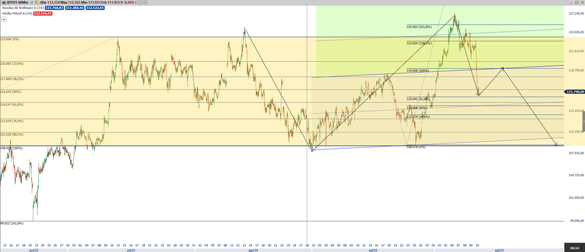 Dá para observar que no traçado original tínhamos um alvo em 118.873 pts e esta semana atingimos os 123.000 pts, que sempre foi considerado nos meus estudos, mas fechamos em 117.565. Ocorre que a ultima onda se formou em 3 movimentos então poderíamos ir além, ou esta onda seria uma onda B, já como parte da correção que seria uma plana expandida o que aponta o alvo neste momento para um retorno do Bitfut para o topo da onda 1, no caso os 70.000 pts. Será que esta movimentação é possível? Seria algo impensável neste momento, mas já tivemos pelo menos duas situações idênticas.