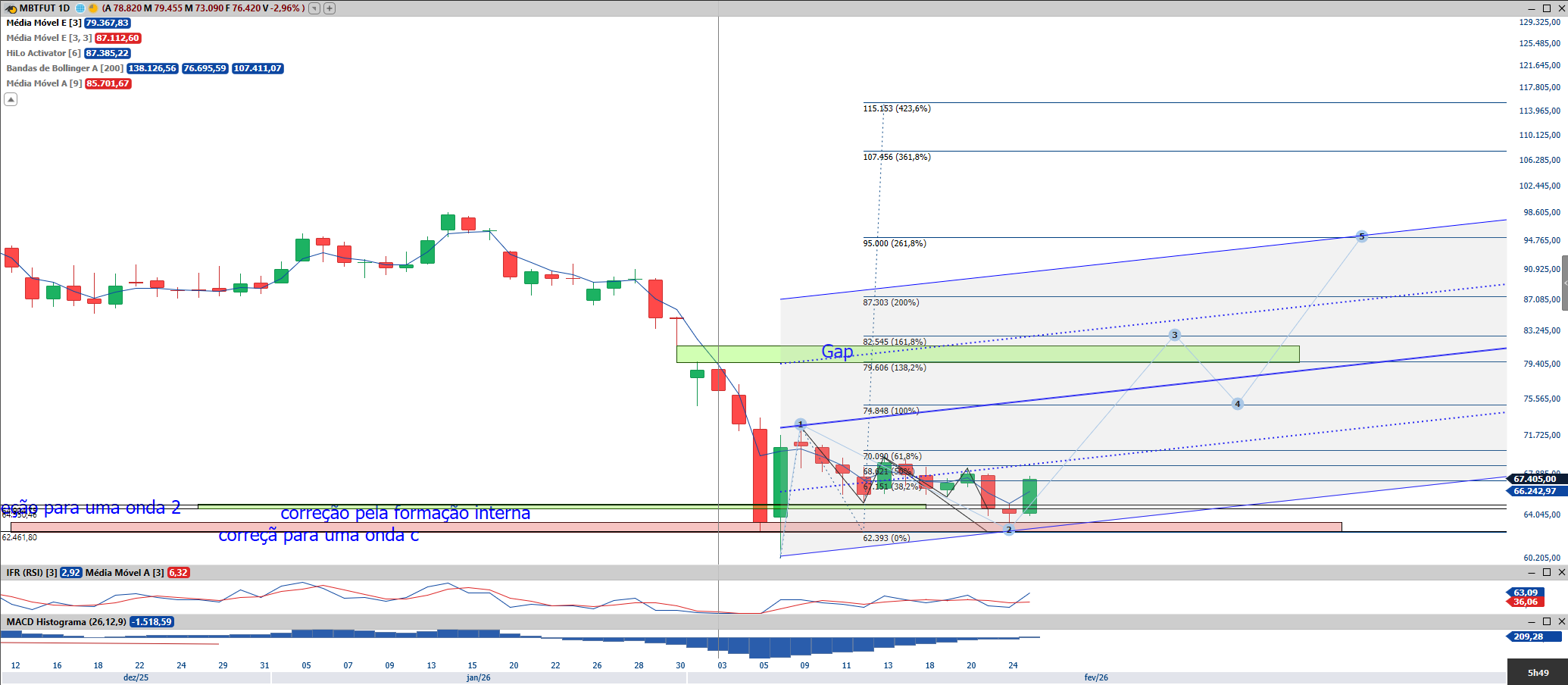 Pelo gráfico diário temos a possibilidade de estarmos em um pequeno impulso que pode levar o ativo até os 106.000 pts, no primeiro movimento, mas por enquanto este é o cenário menos provável. A maré está pouco favorável as criptos neste momento. Eu opero apenas os contratos de futuro, mas quando quero comprar faço através de ETF, em uma composição onde a Hash11 é o principal ativo. Já postei várias vezes esta composição. No ultimo post que coloquei da Hash11, tínhamos a previsão de uma queda de 35,0% e ela caiu exatamente este número e está ensaiando uma recuperação, isto pode ser um indicio de que o pior já passou, mas por enquanto eu não estou me sentindo confortável para entrar em uma posição, mesmo porque as ETFs de cripto da B3 sofrem influência do dólar que subiu cerca de 3,0% este mês.