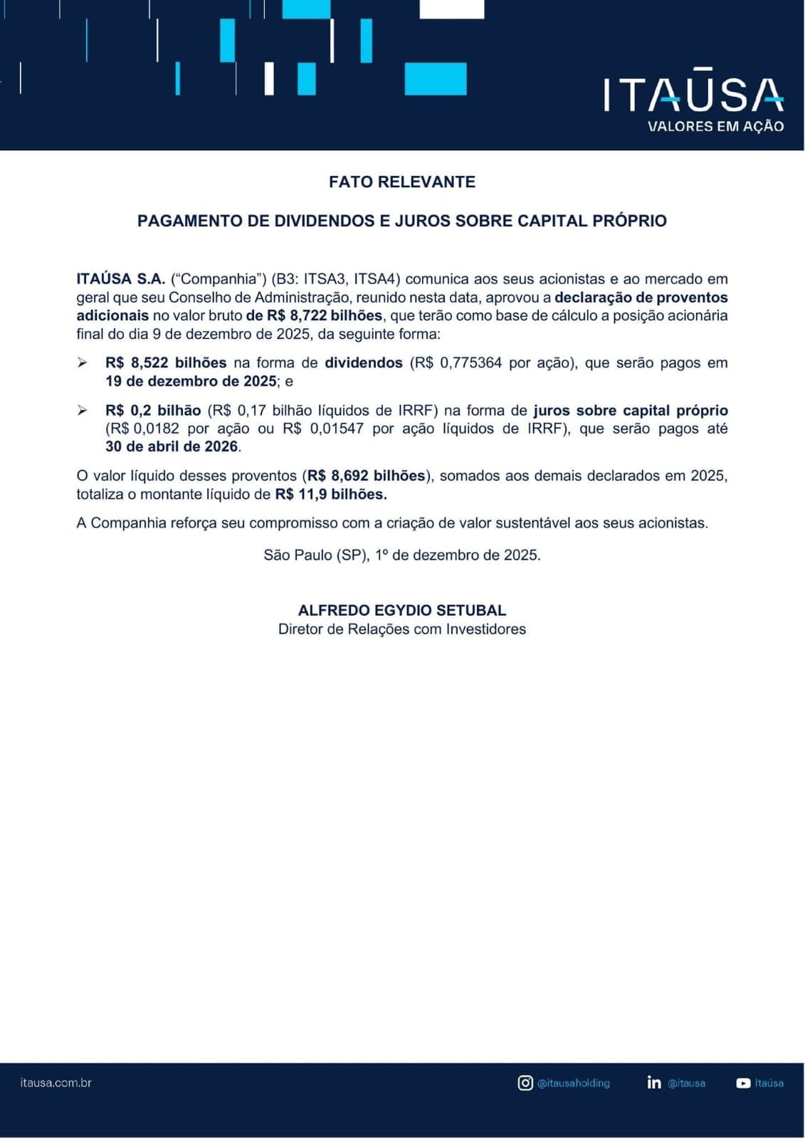 A ITAÚSA reportou lucro líquido recorde de R$ 12,2 bilhões nos nove primeiros meses de 2025, um avanço de 10% em relação a 2024.