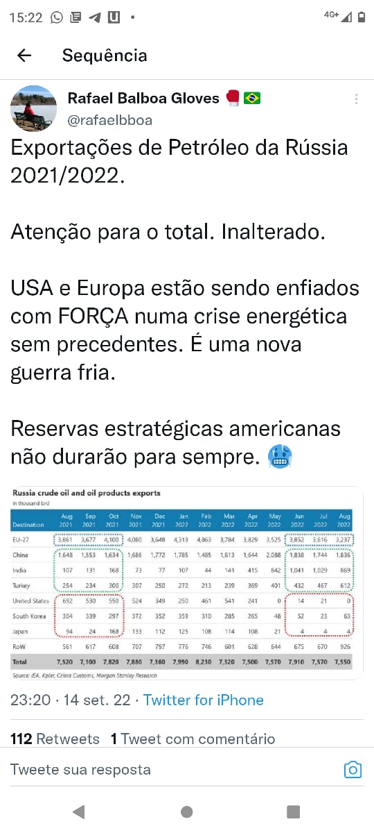 Minha dúvida é como fica a Petrobrás nessa história, grande fornecedora da China, vai perder para o petróleo russo? Vai conseguir outro mercado? Talvez a própria Europa?