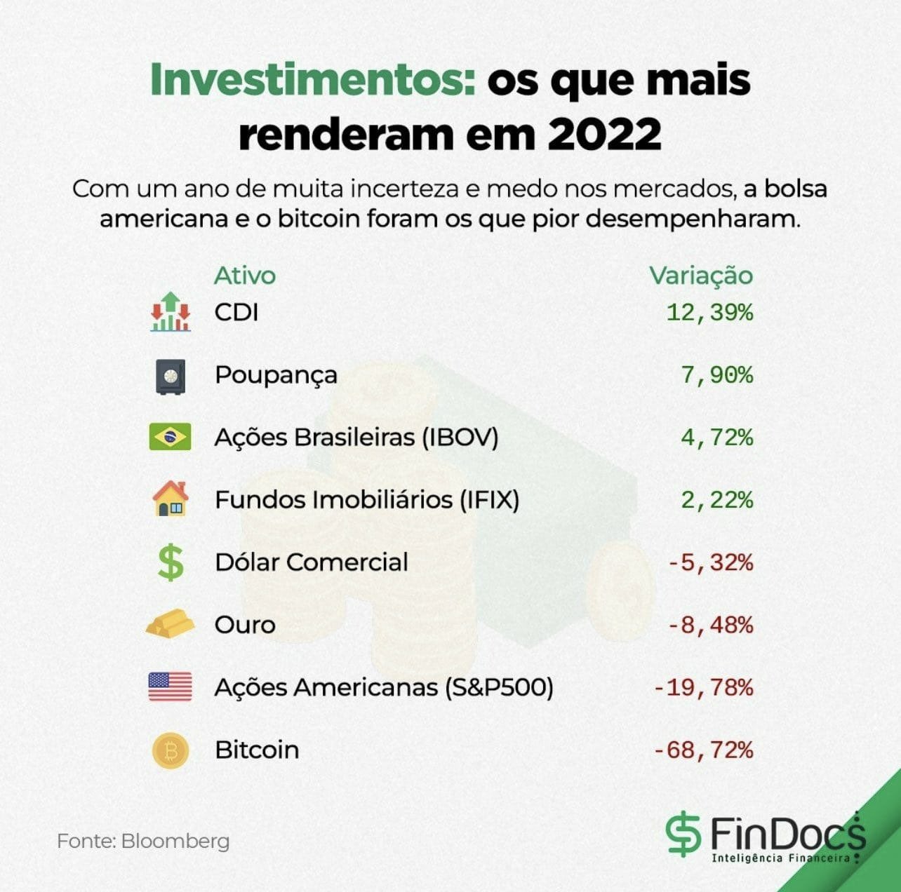 Estou no aguardo do IPCA de 2022, mas acredito que só o CDI e no máximo a poupança bateram o IPCA esse ano. Lembrando que até o dia 30/10/2022, data da eleição, o IBOV estava em 116 mil pontos e o dólar estava a R$ 5,18.
