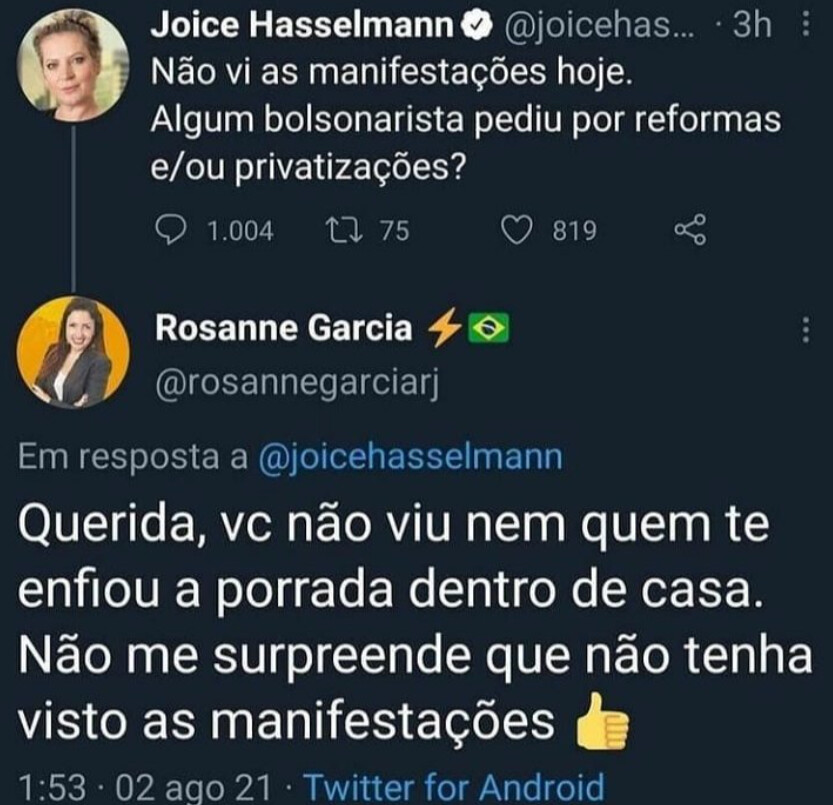 KKK… Muito boas, coitada da Joice tem que cuidar da cabecinha nem os adversários de esquerda e direita entendem o que aconteceu com ela.