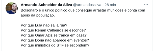 É por isso que o STF e os politico abaixo não querem os votos auditáveis depois de 25 anos você pode me responder ? qual é o medo deles saírem as ruas ? Lula não esta na frente conforme pesquisas! já sei Lula não quer aglomeração, homem muito sensato é esse Lula que construção de campos de futebol é mais importante que hospitais.