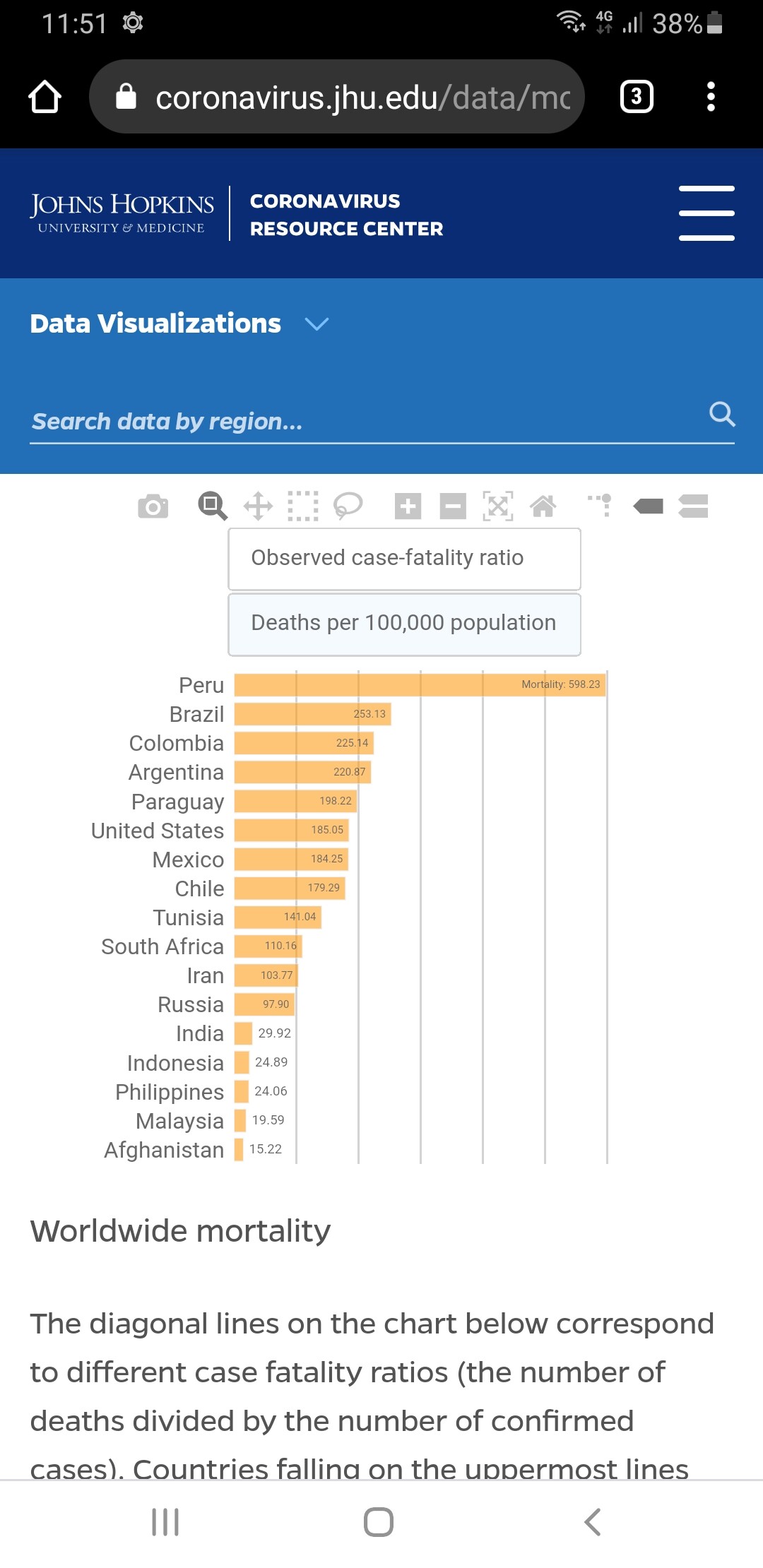 For the twenty countries currently most affected by COVID-19 worldwide, the bars in the chart below show the number of deaths either per 100 confirmed cases (observed case-fatality ratio) or per 100,000 population (this represents a country’s general population, with both confirmed cases and healthy people). Countries at the top of this figure have the most deaths proportionally to their COVID-19 cases or population, not necessarily the most deaths overall.