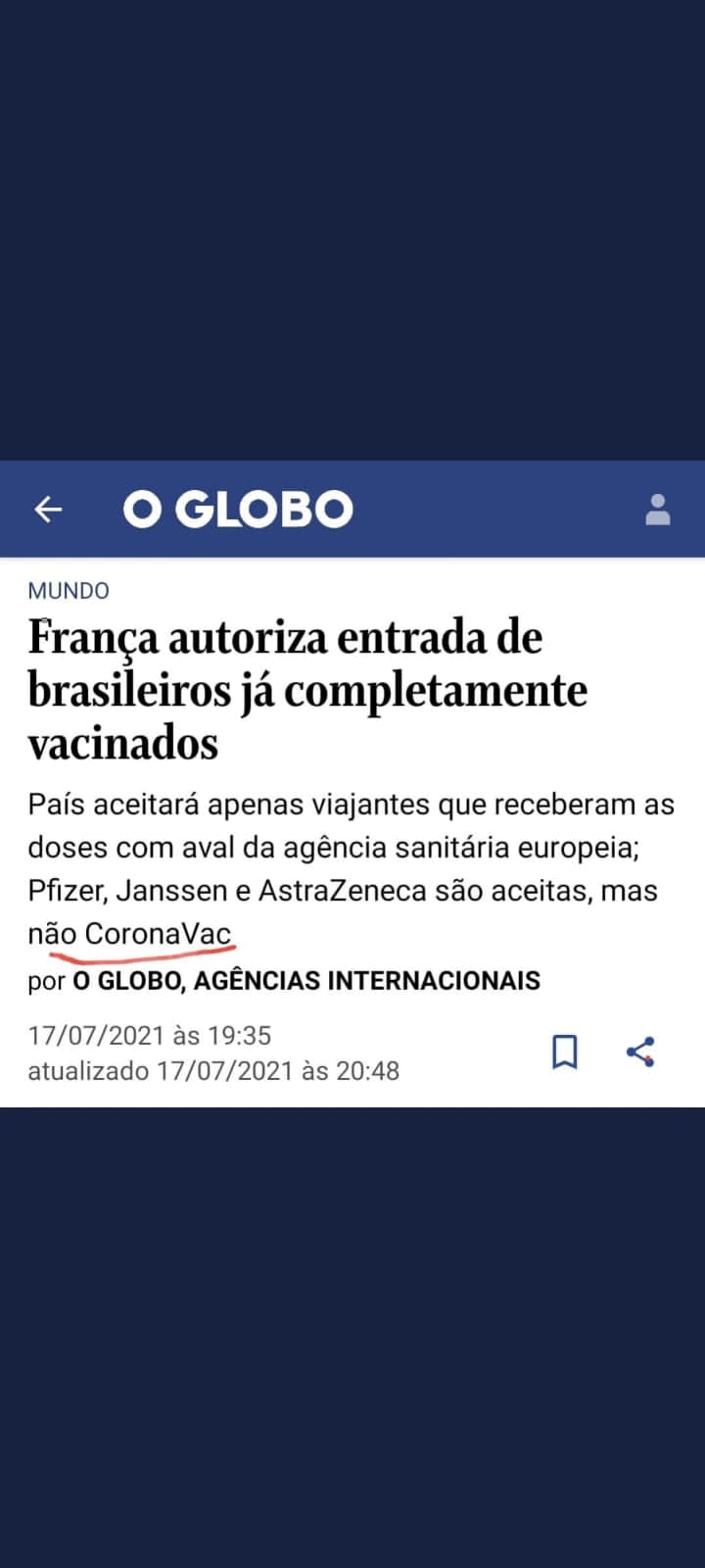 As demais vacinas, mesmo algumas não aprovadas pela agência francesa não estão barrando a entrada, mas a coronavac sim.