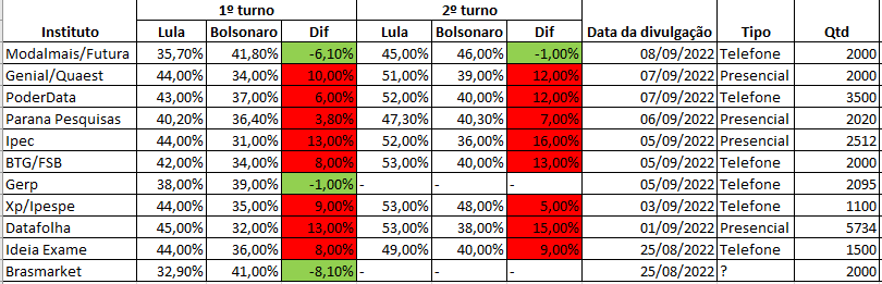 Conforme aponta a pesquisa IPEC de 12/09, Lula aparece com 46% das intenções de voto. Enquanto isso, Bolsonaro chegou a 31% do eleitorado. O Ipec também traçou o cenário de um eventual segundo turno. De acordo com o levantamento, o petista venceria as eleições, com 53%, contra 36% do atual presidente