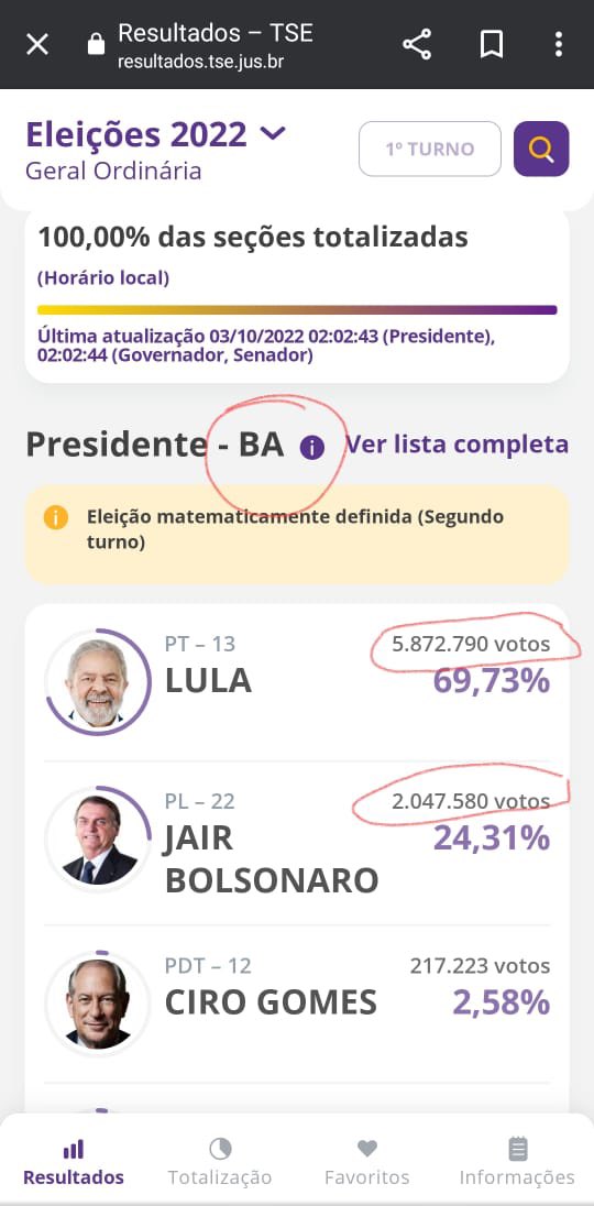E indo um pouco além na análise do 1 turno, olha como ficou o resultado na Bahia. Praticamente a diferença em número de votos nacionais entre os dois.