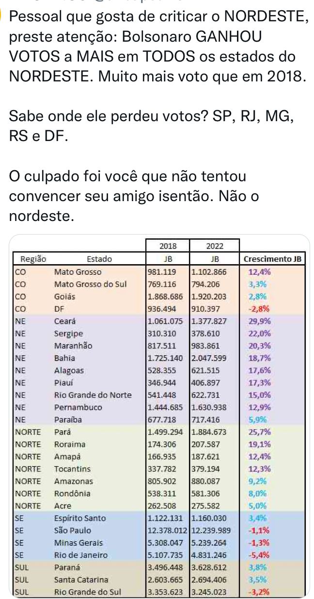 O que eu vejo é o seguinte: os lugares onde Lula é soberano ele não tem mais o que ganhar, só teria a perder a mesmo. Os lugares onde Bolsonaro venceu, ele tem espaço para ampliar a vantagem (mas obviamente que pode ter a vantagem reduzida também).
