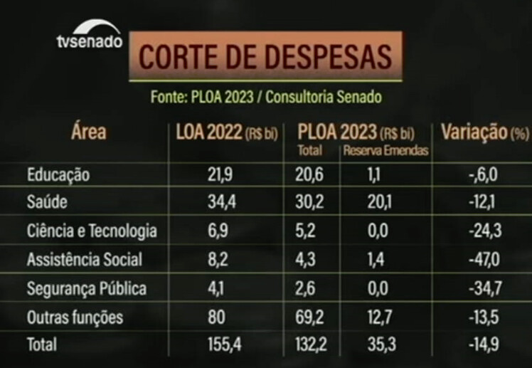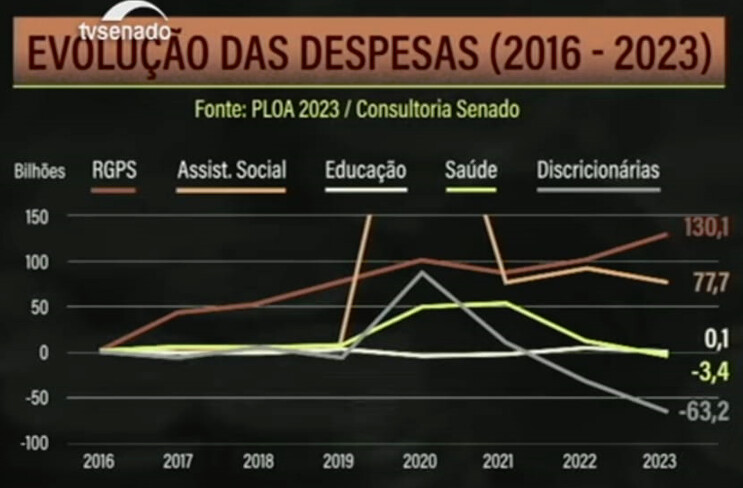 O que acontece é que as despesas com previdência social e assistência estão crescendo acima da inflação, dessa forma o orçamento fica cada vez mais sufocado, vejam essas imagens do próprio Senado ao observar a LOA de 2023. Devido ao teto, mesmo com superávit, as despesas discricionárias cederam 63% em relação a 2022! Aí ficam saindo essas matérias sensacionalistas dizendo que o Gov cortou gastos em Saúde e Educação. Isso será um problema de qualquer presidente e precisa ser resolvido com urgência.