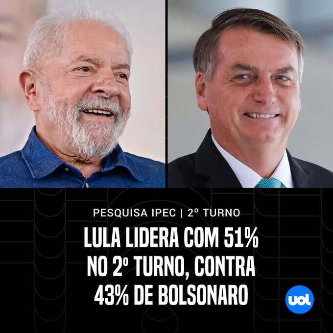 Lula tem 51% e Bolsonaro 43% no segundo turno, diz Ipec | VEJA
