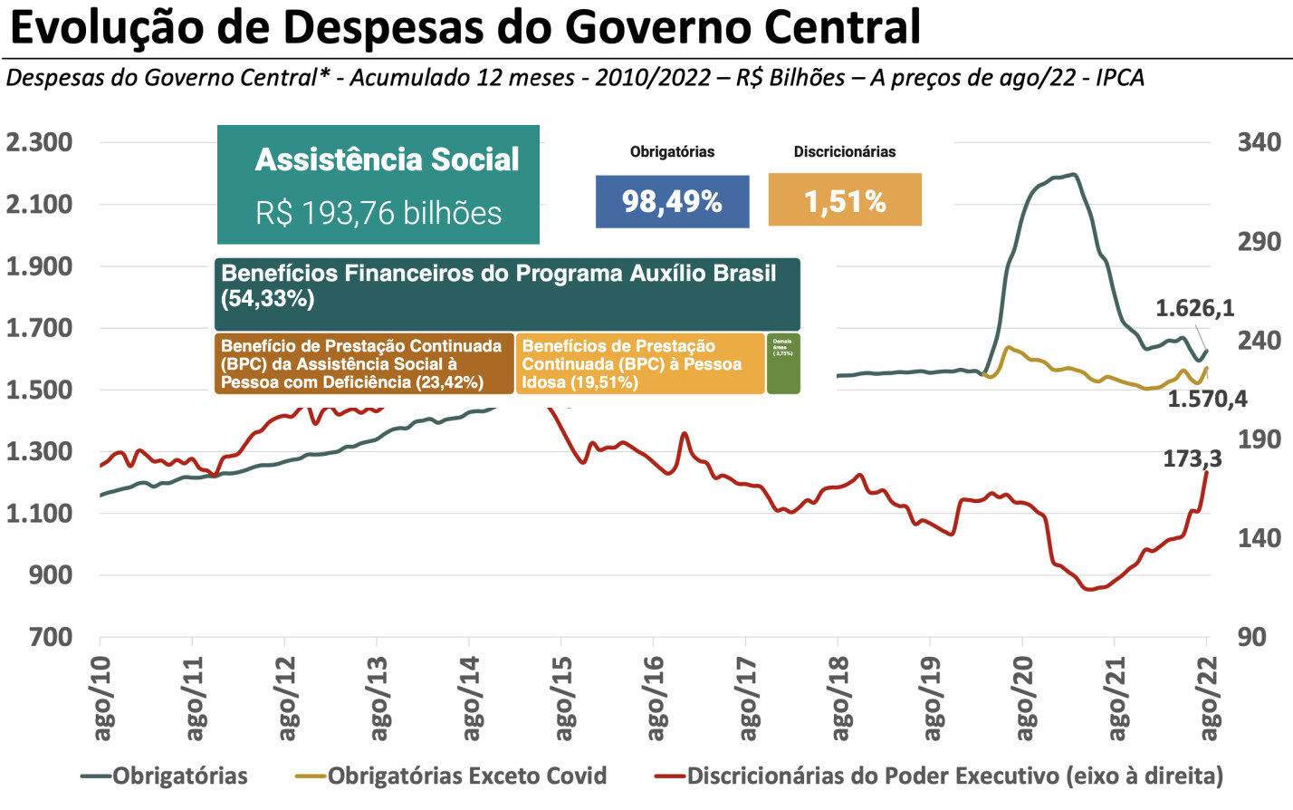 Não partilho, @luizlh. Primeiro sugiro o exercício de esquecer esta separação entre despesas discricionárias e obrigatórias. É um conceito infeliz. Se amanhã entrássemos em guerra contra qualquer país vizinho, as despesas com Defesa não seriam nem discricionárias nem obrigatórias, seriam, simplesmente seriam. As despesas com transferência de renda foram classificadas como obrigatórias. Na verdade, a arrecadação está subindo não só além da inflação, como além do PIB, mas arrumaram este problema. O problema não é a previdência. Os números da previdência estão vindo muito bem em linha com o esperado pela reforma. Mas quando você fala Assistência, está falando basicamente em Auxílio Brasil. Na verdade, as contas do governo estão muito além do esperado, mas eu realmente não sei se é desespero para se manter no poder ou esforço genuíno, tirando daqui e colocando ali. Os números do Bolsonaro vs PT, corrigidos pela inflação, já estão se aproximando, em questão de Bolsa Família vs Auxílio Brasil, já estão de igual para igual e capaz desse ano bater.