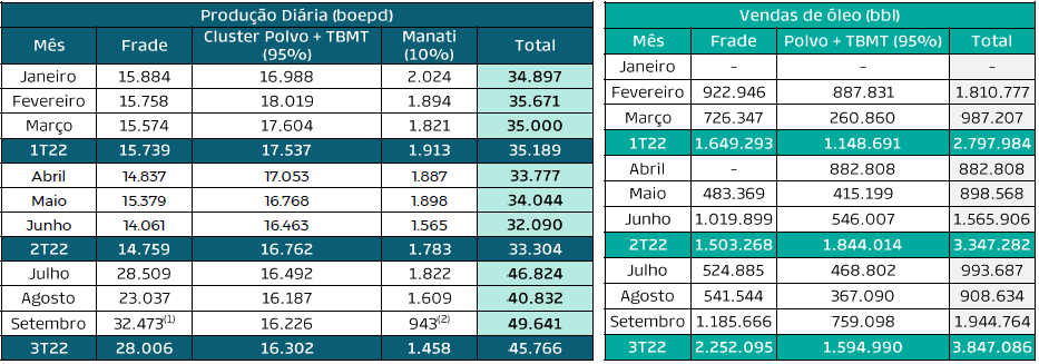 (1) O poço MUP3A, no Campo de Frade, teve sua produção temporariamente interrompida devido a uma falha no equipamento de completação e será reparado durante o quarto trimestre.