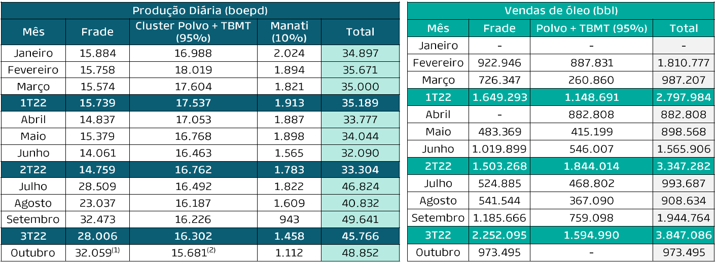 (1) O poço MUP3A, no Campo de Frade, teve sua produção temporariamente interrompida devido a uma falha no equipamento de completação, com expectativa de reparo concluído no 1T23.