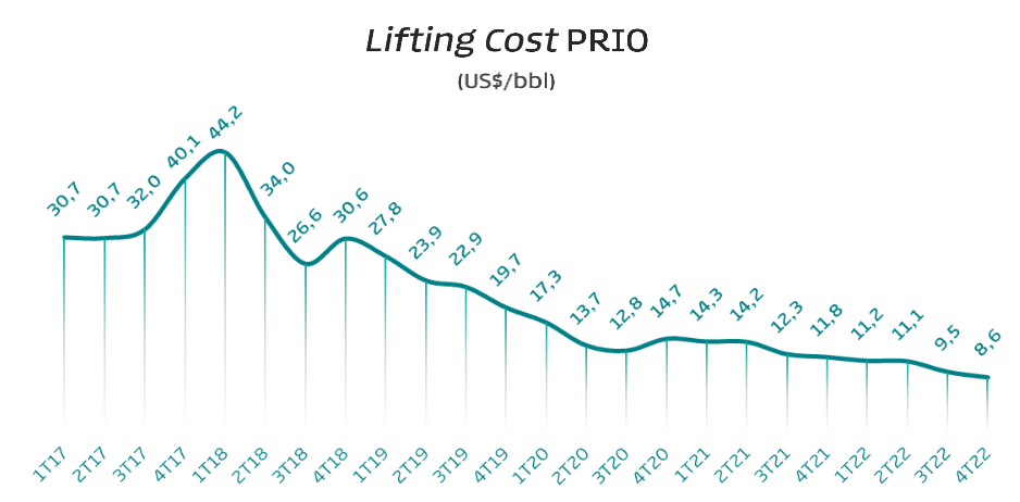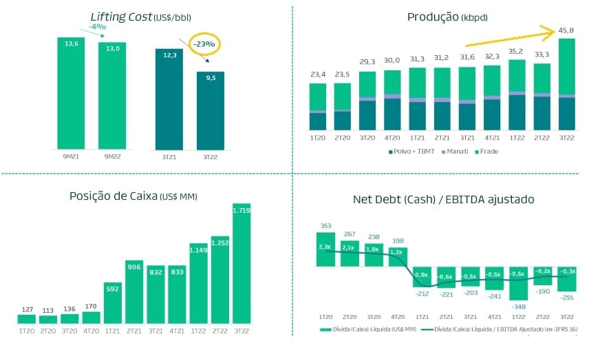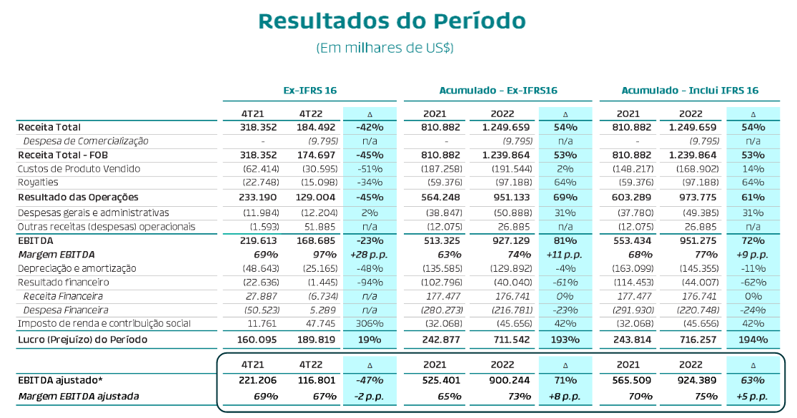 Tudo certo. Apesar da perfuração de 2 novos poços produtores em Frade em 2022, incrementando a produção em +47% no 4T22, as vendas menores no 4T fizeram com que a companhia tivesse uma queda pontual no trimestre da receita.