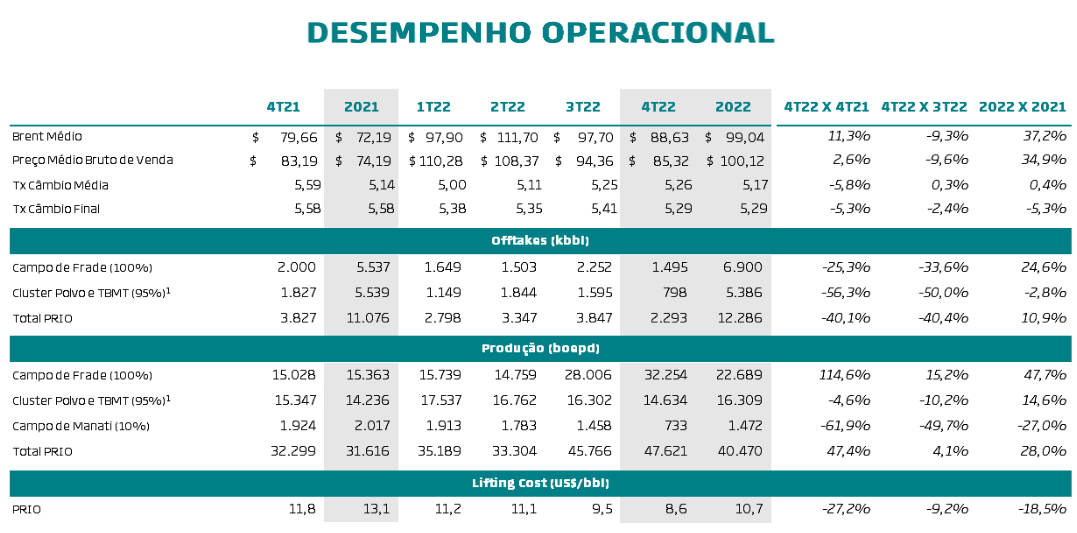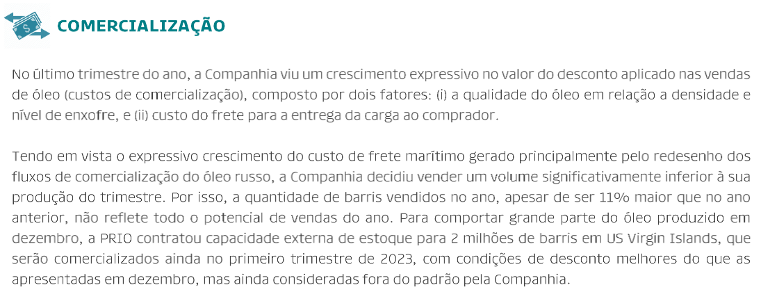 (3) Em dezembro, tendo em vista o grande deslocamento do custo de frete marítimo gerado principalmente pela imposição do “price cap” sobre o óleo russo, a Companhia decidiu vender um volume significativamente inferior à sua produção do trimestre. Para tanto, a PRIO contratou capacidade externa de estoque para 2 milhões de barris em US Virgin Islands e este volume armazenado deverá ser negociado nos próximos meses, já com indícios de melhora na comercialização.