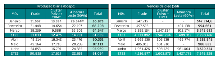 (1) Os dados de Albacora Leste no mês de janeiro referem-se à 90% de participação da PRIO no campo, considerando a produção ao longo de todo o mês. Dado que o closing da aquisição ocorreu em 26 de janeiro de 2023, o campo contribuiu proporcionalmente com 5.919 barris por dia ao longo do mês de janeiro.
