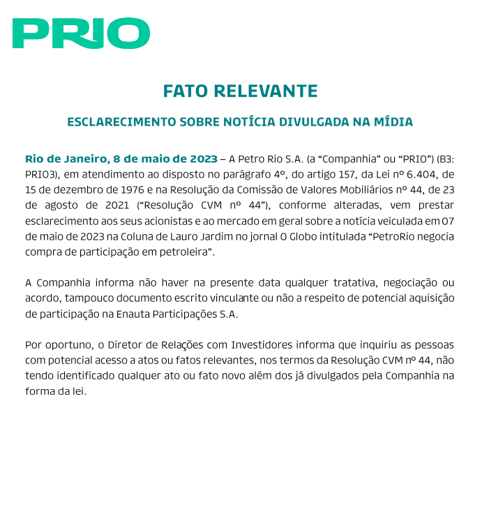 Rio de Janeiro, 04 de julho de 2023 - A PRIO S.A. (“Companhia” ou “PRIO”) (B3: PRIO3), em linha com as melhores práticas de governança corporativa e transparência, informa seus Dados Operacionais preliminares e não auditados referentes ao mês de junho.