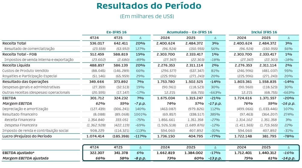 Obs.: Lucro do 4T24 foi impacto positivamente pelo reconhecimento do crédito fiscal da Dommo e o prejuízo do 4T25 foi impactado negativamente pela depreciação das novas aquisições consolidadas e pelo efeito cambial na base tributária (sem efeito caixa).