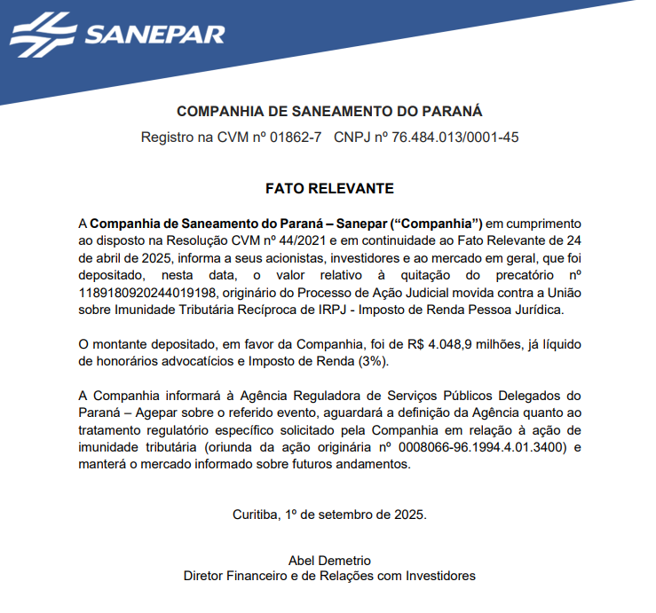 A Companhia de Saneamento do Paraná – Sanepar (“Companhia”), em