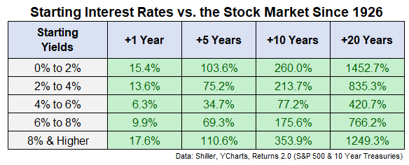 A tabela cruza a taxa de inflação inicial com os retornos acumulados das ações em 1, 5, 10 e 20 anos.