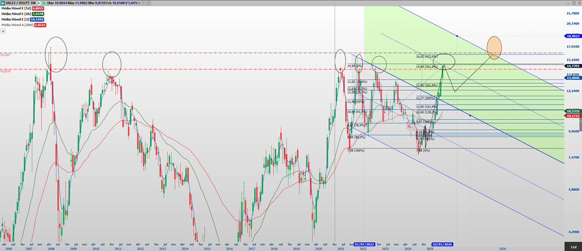 Em ambos os casos teríamos o limite desta alta da Vale na região de 16,00. Não sei se deveríamos considerar o fator inflação que entre 2008 e 2026 foi cerca de 50,0% (inflação americana). Nos outros testes desta região parece que não foi considerada.